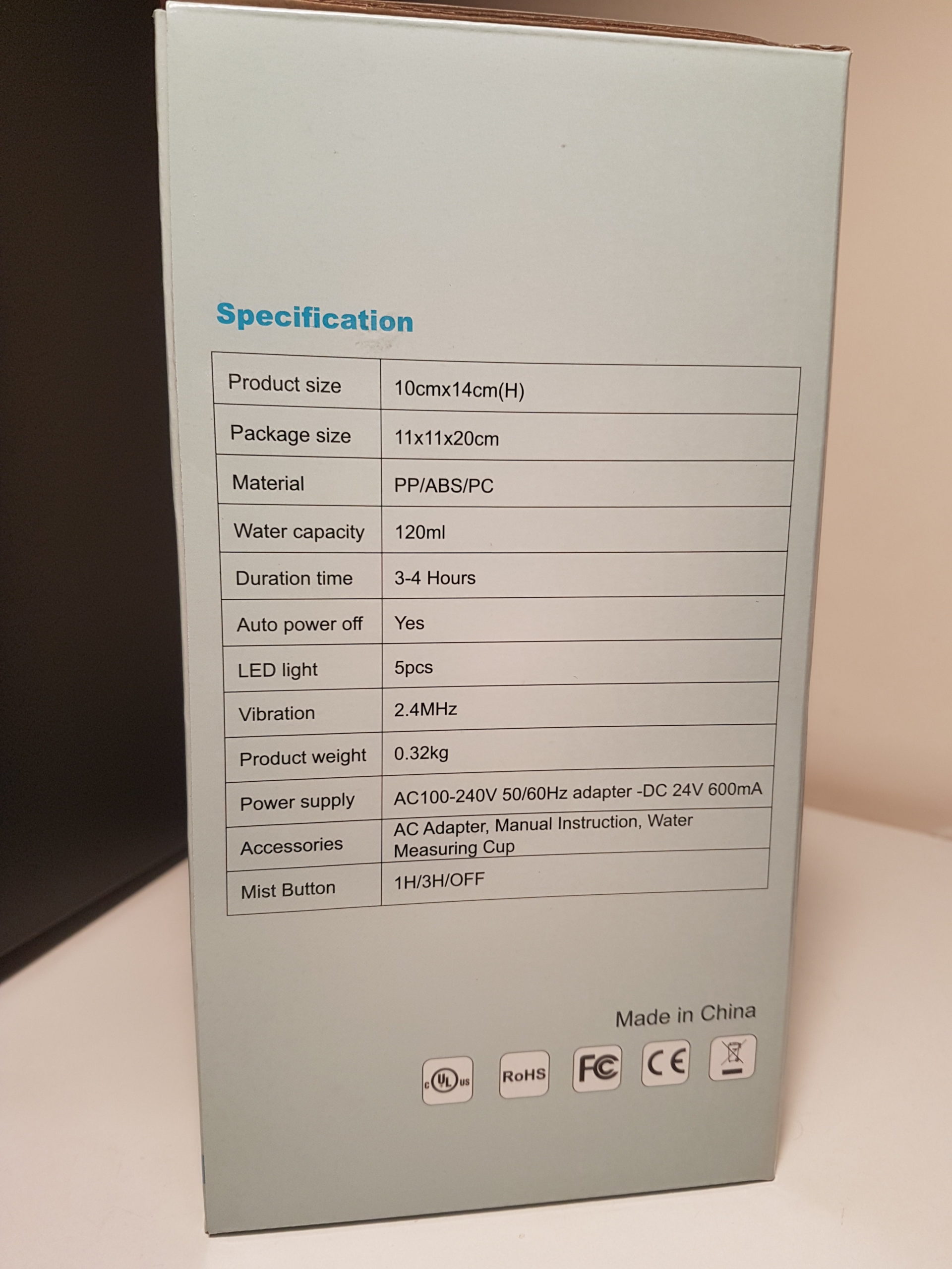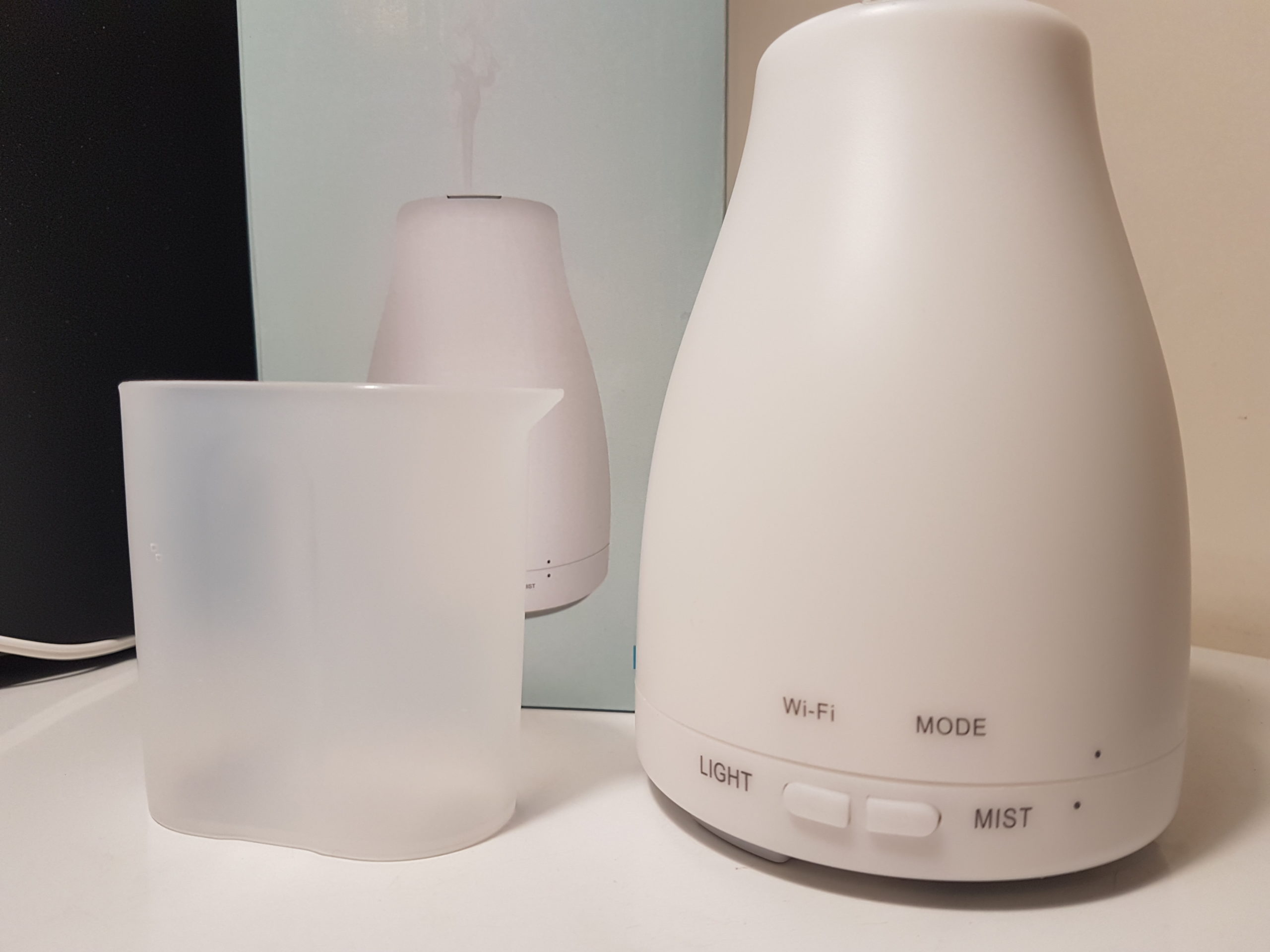 Le diffuseur est présenté dans un joli carton aux couleurs pastel qui nous mettent, dès le départ, dans une ambiance empreinte de douceur et de « zenitude »… Oui, bon, nous exagérons peut-être un peu, mais c’est probablement à cause des effets relaxants de la séance d’aromathérapie que nous venons de « subir » pour mener à bien ce test! Toujours est-il que la présentation est plaisante. L’emballage reprend les caractéristiques principales de l’appareil, ainsi que les logos Amazon Alexa, Google Home et IFTTT. Vous pourrez donc les utiliser indifféremment avec ces deux assistants vocaux, mais aussi avec le célèbre web service si vous n’avez pas un assistant vocal aussi performant qu’Alexa! Suivez mon regard…