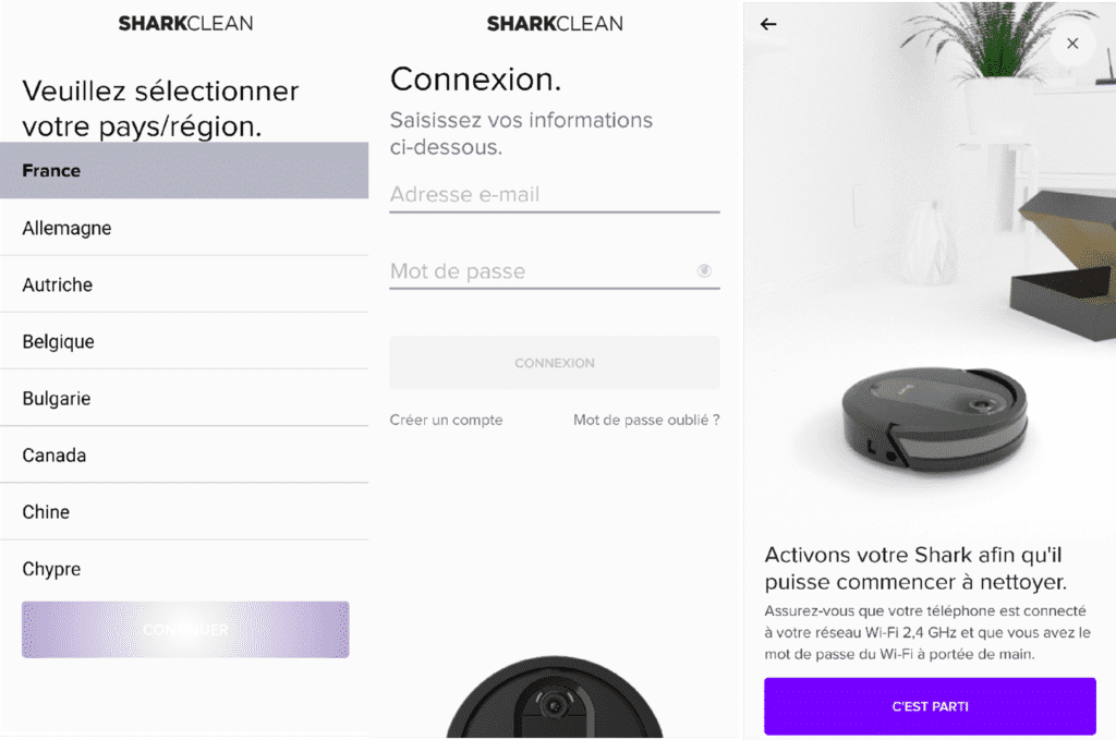 Shark a décidé d’utiliser sa propre application Shark Clean pour utiliser le S.IQ.R. Il est donc nécessaire de commencer par créer un compte en utilisant votre courriel et un mot de passe (chiffres et lettres) … Vous recevrez un lien par email afin de venir activer vos identifiants. De retour dans l’application, saisissez de nouveaux vos informations et voilà. L’application vous propose tout de suite d’installer votre robot. Activez bien sûr le GPS de votre smartphone et mettez-vous sur le réseau Wi-Fi qui va être relié au robot.