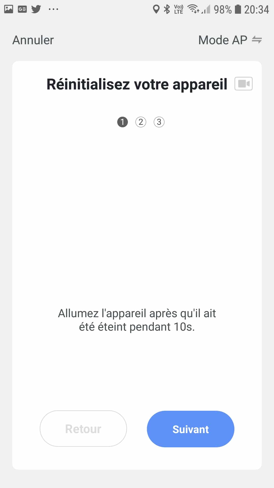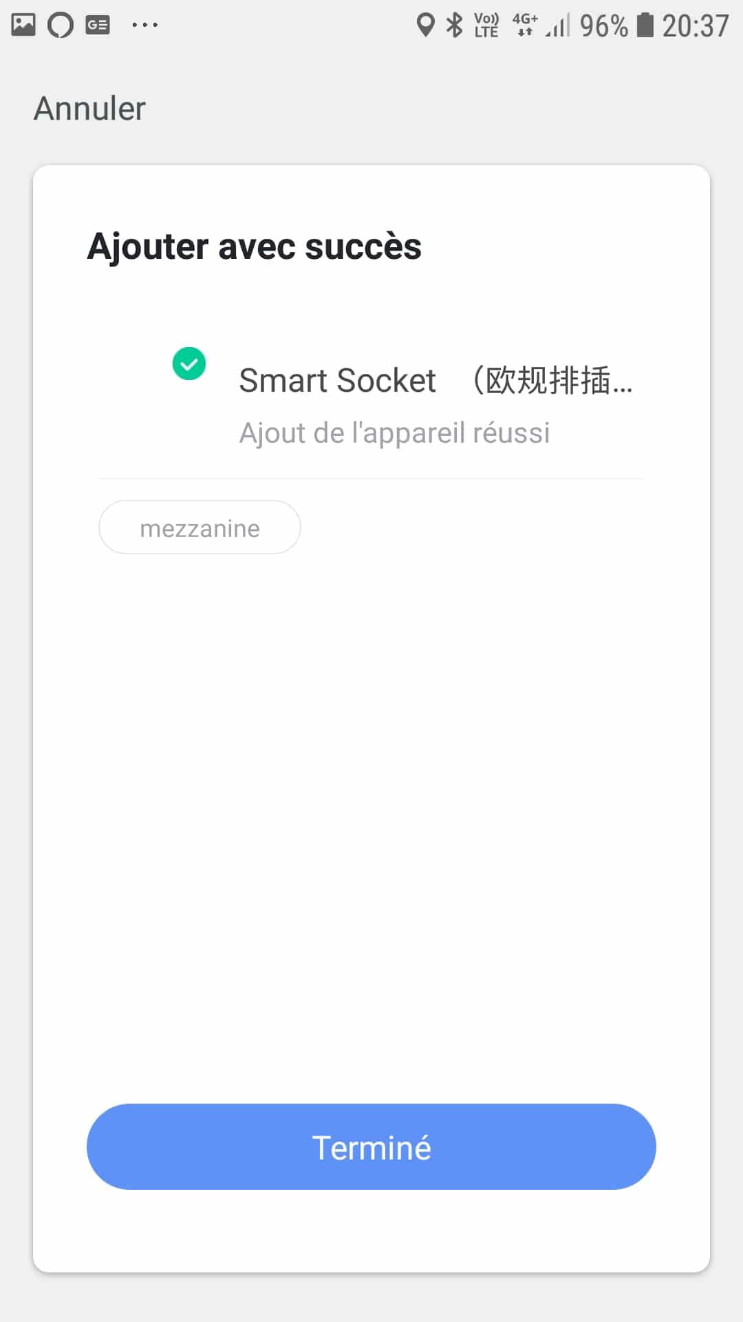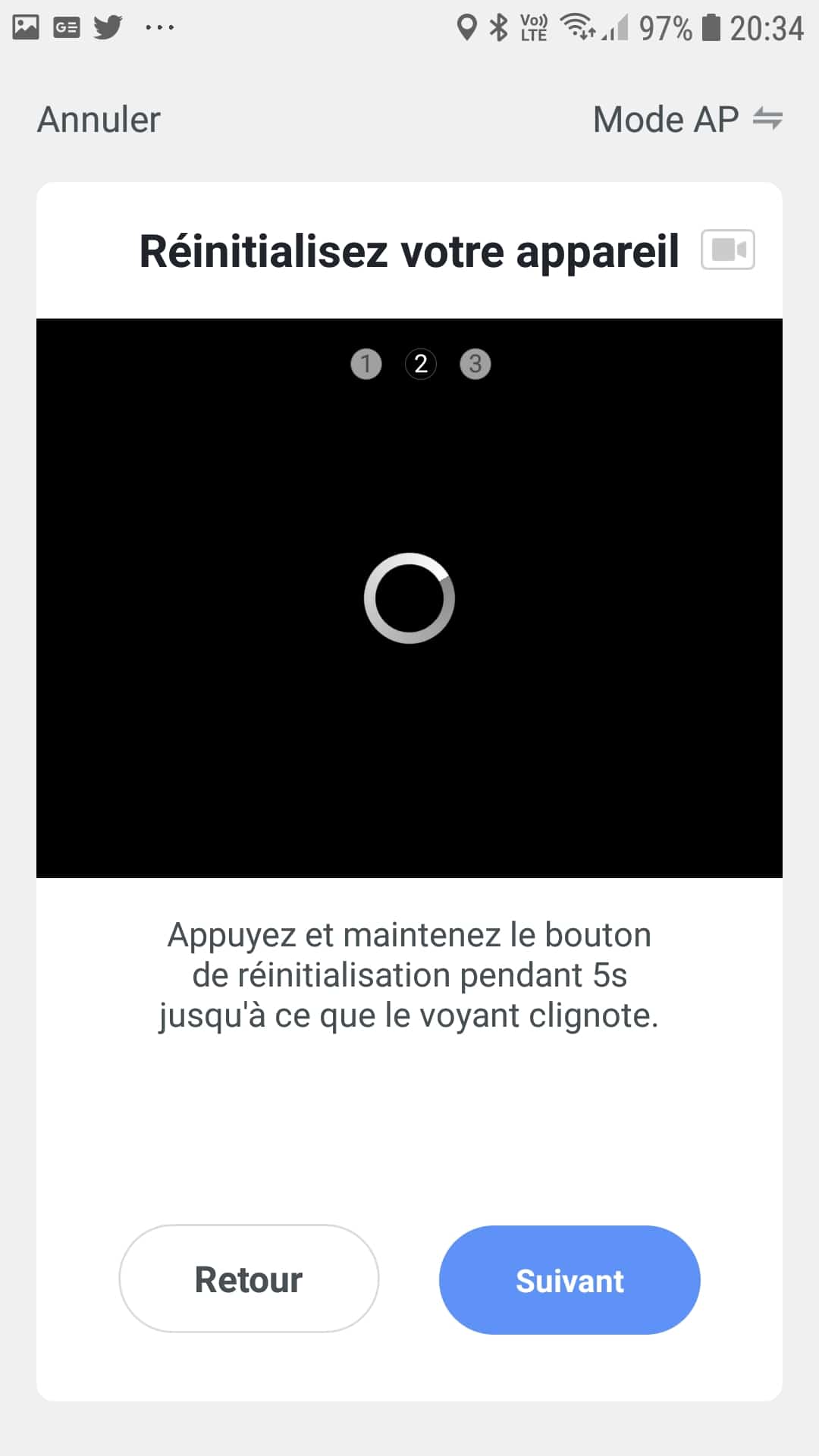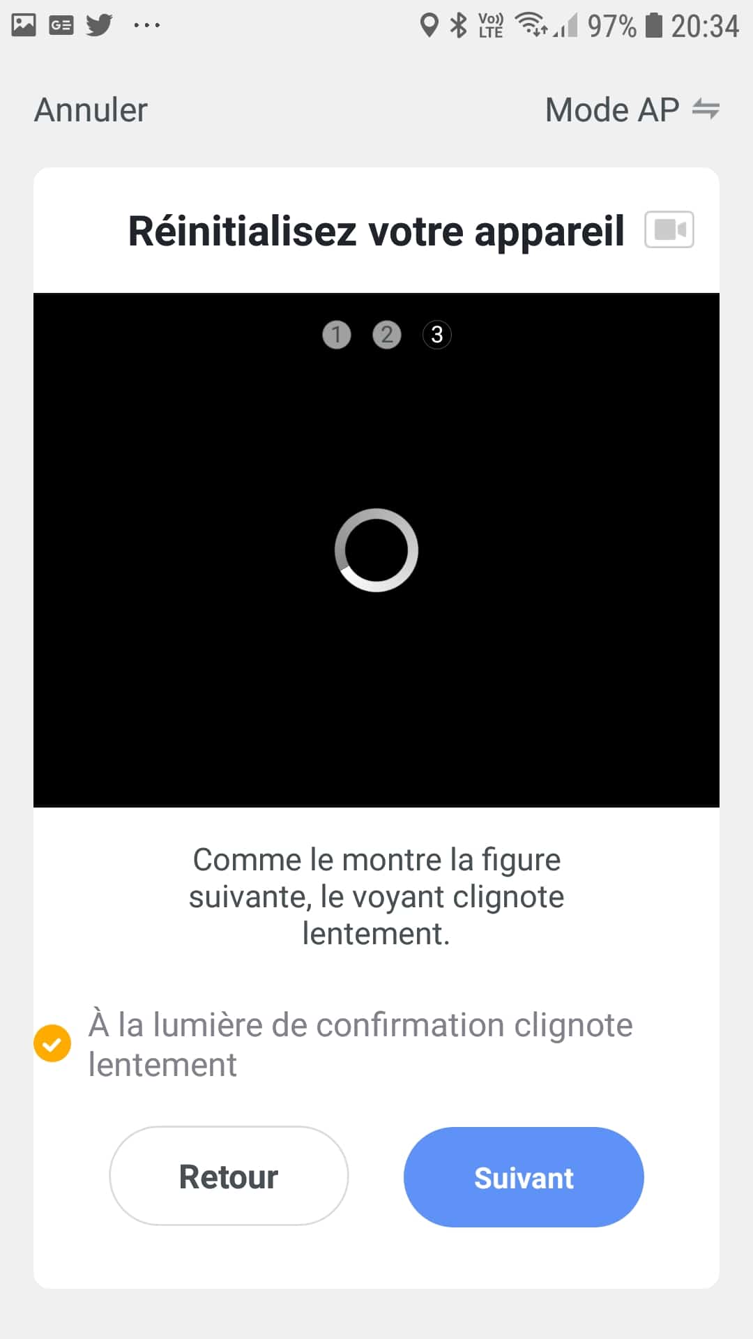 En cliquant sur suivant, l’application nous invite à réinitialiser l’appareil. La mise en tension de celle-ci devrait la mettre en mode appairage d’emblée, sinon il faut simplement débrancher et rebrancher la prise en ayant attendu une dizaine de seconde entre deux. Une fois remise sous alimentation électrique, un simple appui sur le bouton ON/OFF de la multiprise jusqu’à ce que celle-ci clignote lentement enclenche la procédure. La nouvelle version de l’application Smart Life, demande d’ailleurs une confirmation avant de poursuivre. Si le bouton clignote comme demandé, il suffit de cocher la petite case prévue à cet effet. Attention, ça ne prend pas toujours du premier coup la coche mais quelques tentatives de clic pour que celle ci soit prise en compte devrait suffire..