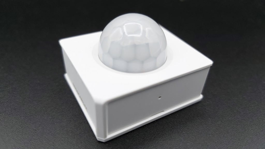 Sortons le détecteur d’ouverture Sonoff SNZB-03. Pas bien grand avec ses 4 cm x 3.5 cm pour 2.8 cm d’épaisseur totale et seulement 21 grammes d’affichés sur notre balance, pile incluse, sa taille est franchement appréciable ! A part le détecteur de mouvement Aqara Motion Sensor, difficile de trouver plus compact. Dans la boite est joint le guide d’installation avec l’étiquette contrôle qualité (pour la petite histoire, c’est toujours le même contrôleur) et le petit adhésif carré 3M pour assurer une bonne fixation. L’œil, non du cyclone mais du capteur, est en plastique translucide avec des facettes façon nid d’abeille. A l’avant on perçoit le petit trou dans lequel on viendra y glisser une épingle pour lancer l’appairage.
