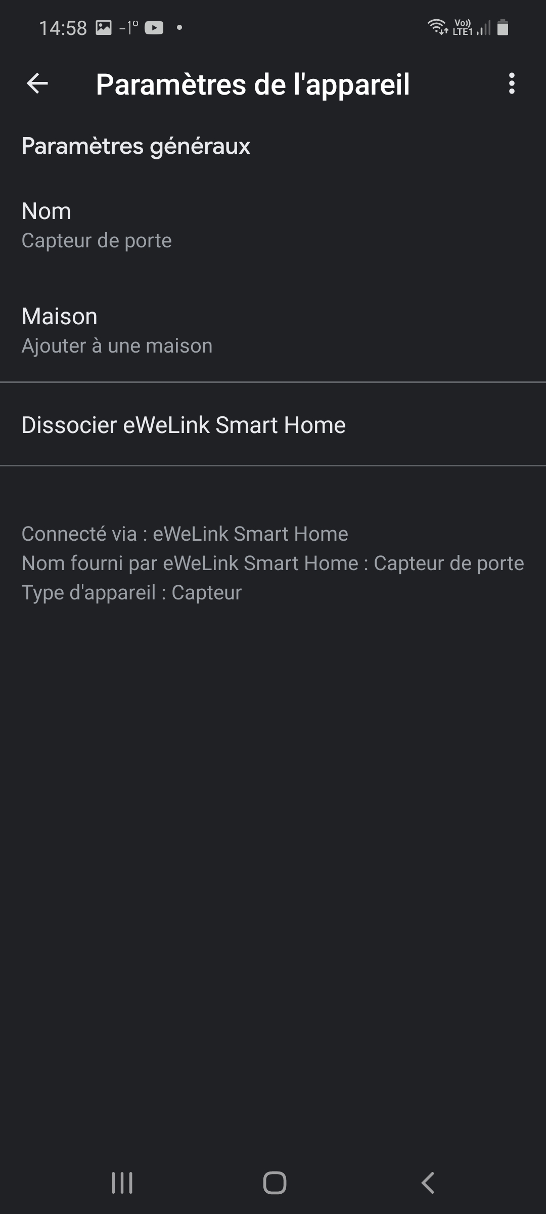 Le détecteur de porte remonte bien, mais ne sera pas intégrable dans une routine. Seul le statut de la porte pourra être obtenu en interrogeant l’assistant vocal. Dommage. Celui-ci sera visible sur l’écran du Google Nest mini, mais pas directement sur l’application. Là aussi c’est dommage car pratique quand on est à l’extérieur.