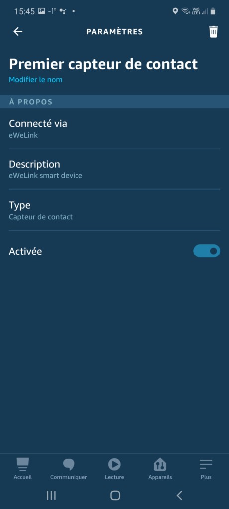 Le détecteur Sonoff SNZB-04 remonte bien dans l’application, les scenarii sont possibles et s’exécutent sans difficulté. Un très bon point. Testé ici aussi en double scénario avec un fait sur l’application maison de Sonoff et un autre fait dans l’application Alexa où l’on demande à notre assistante vocale préférée de nous dire « ouverture » lorsque le détecteur est activé, nous avons constaté une latence de trois secondes pour l’annonce vocale là où le scénario interne à l’application eWeLink Smart Home n’en met qu’une à réagir.