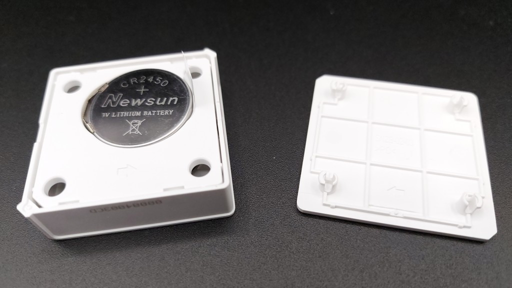 Lui aussi est dans le même type d’emballage, carton fin et orange avec bien sur sa représentation en façade et sa référence sur le dessus : Sonoff SNZB-02. Ici aussi on trouve joint un dépliant de démarrage rapide, le certificat de contrôle qualité et un adhésif 3M du même format (pour une fixation murale par exemple) que le petit thermomètre qui mesure : 4.3 cm x 4.3 cm x 1.4 cm pour 28 grammes seulement pile incluse ! La miniaturisation s’exprime pleinement ici. Conçu dans la même qualité de plastique que le bridge, il en épouse aussi la forme avec les quatre angles arrondis dont deux biseautés. Ces derniers assurent d’ailleurs une parfaite prise en main.