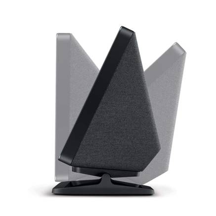 Il fait 24,5 cm de largeur, 12 de profondeur et 3,5 de hauteur. Sur le principe, une fois monté, il ne dépasse pas de l’Echo et ne prends pas plus de place au sol que l’appareil nu (par rapport à son encombrement maximum par rapport à la surface en contact avec le sol). Il est en fait constitué de 2 parties déjà montées : une partie supérieure sur lequel le Show 2 viendra se fixer et une partie inférieure qui est le pied du support. Les deux parties s’articulent l’une par rapport à l’autre sur un axe horizontal. Donc effectivement, votre Show 2 pourra opiner du chef mais pas tourner de côté.