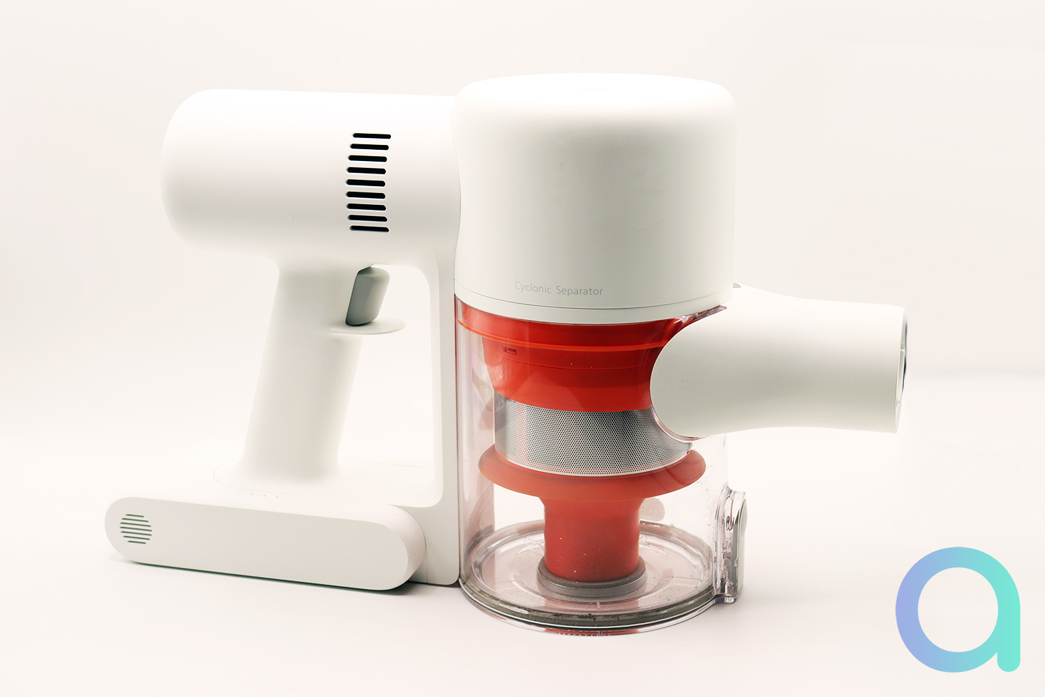 Le système de filtration multi-cyclonique aux couleurs de la marque se dévisse donc par le haut à l’aide d’une petite poignée escamotable. La filtration s’y effectue par 12 cyclones sur 5 niveaux dont un filtre HEPA en mousse. Cela permet de capturer 99.97% des allergènes jusqu’à 0.3 micron. Le tout est très facilement lavable tout comme l’ensemble du système. Nous vous conseillons de le faire régulièrement afin de conserver une bonne puissance d’aspiration et d’éviter de faire chauffer le moteur. Notez qu’il est nécessaire de bien laisser sécher le tout avant de le replacer, Xiaomi préconisant de laisser sécher 24 heures avant de le replacer.