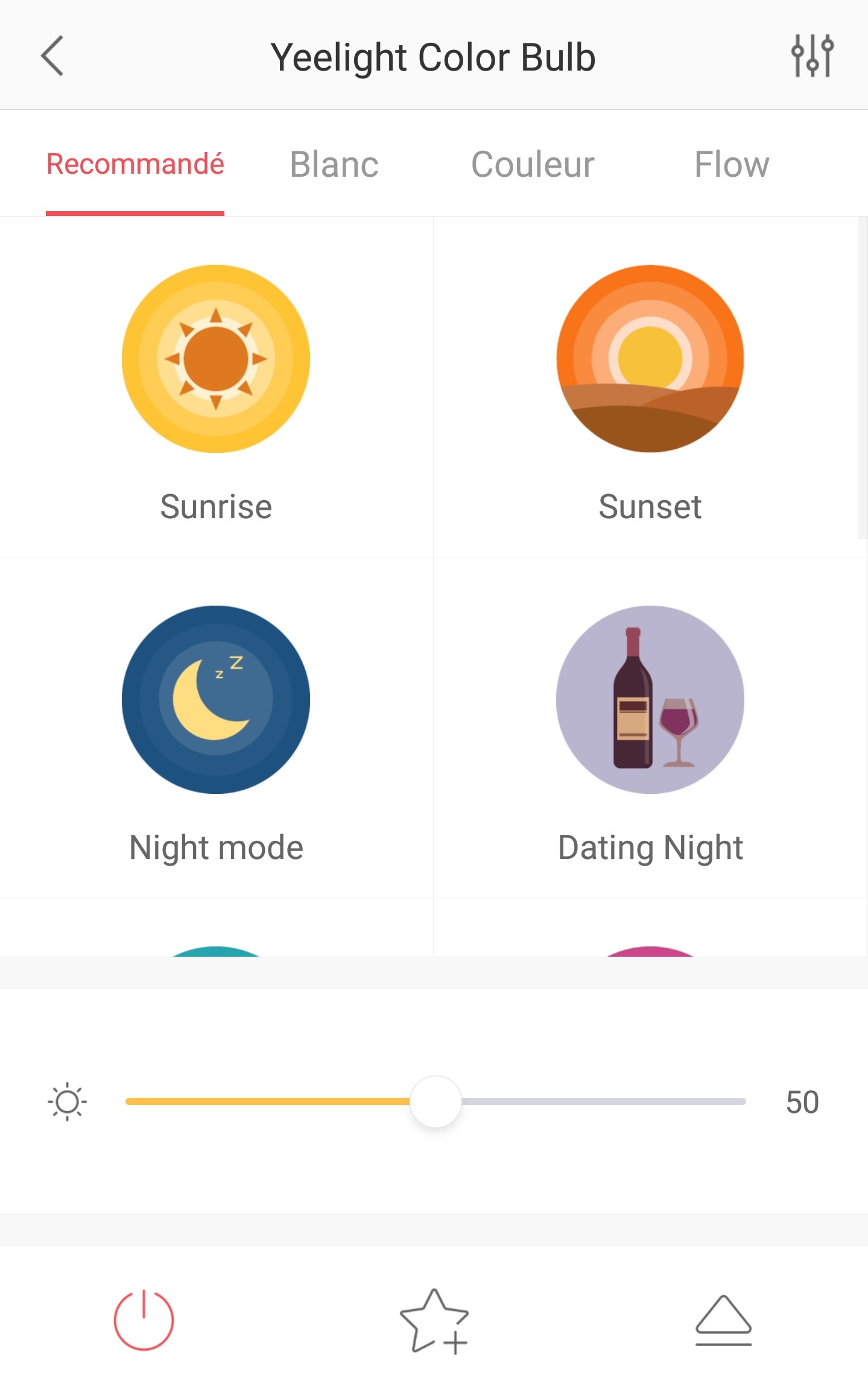 Cette ampoule multi couleur permet d’adapter l’ambiance de votre intérieur selon vos envies et vos besoins. L’application est assez bien faite en vous proposant une dizaine de scènes préprogrammées : couleur levée de soleil (orange tamisé), couché de soleil (blanc intense), night mode (jaune tamisé), Dating Night (or tamisé),Movie (bleu tamisé), Birthday Party (alternance de couleurs), Romance (saumon tamisé), Home (blanc),flashing (pour une routine quand vous recevez un mail par exemple) et candle flicker (impression de feu de cheminé). Et si vous ne trouvez pas votre bonheur, vous pouvez directement choisir la couleur qui vous satisfera et l’enregistrer.
