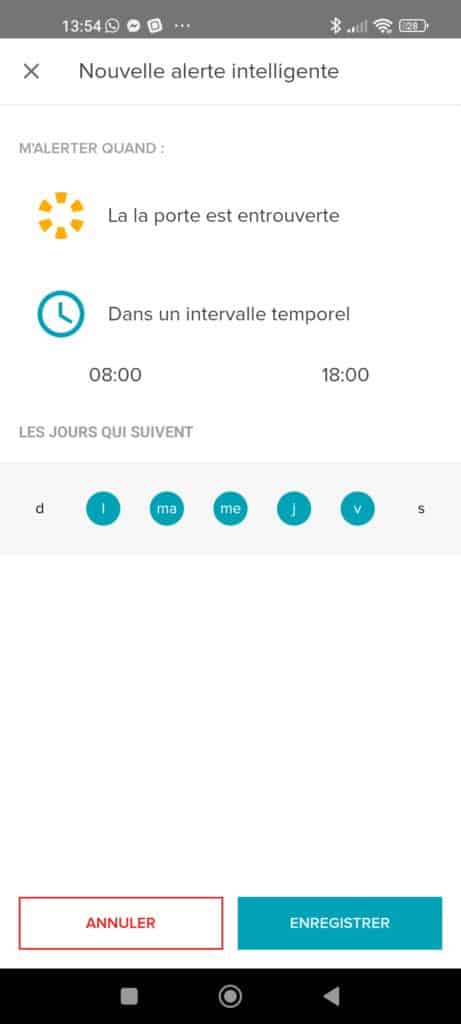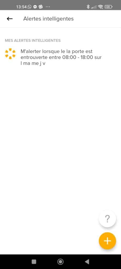- Temporisation de porte entre ouverte : C’est un parfait complément à l’alerte intelligente qu’il est possible de créer car en bas de page un renvoi vers la création d’alerte est proposé. Pratique vous déterminez le temps « acceptable » d’ouverture. Modulable entre 1 min et 30 min, la sélection se fait par palier de 1 min.