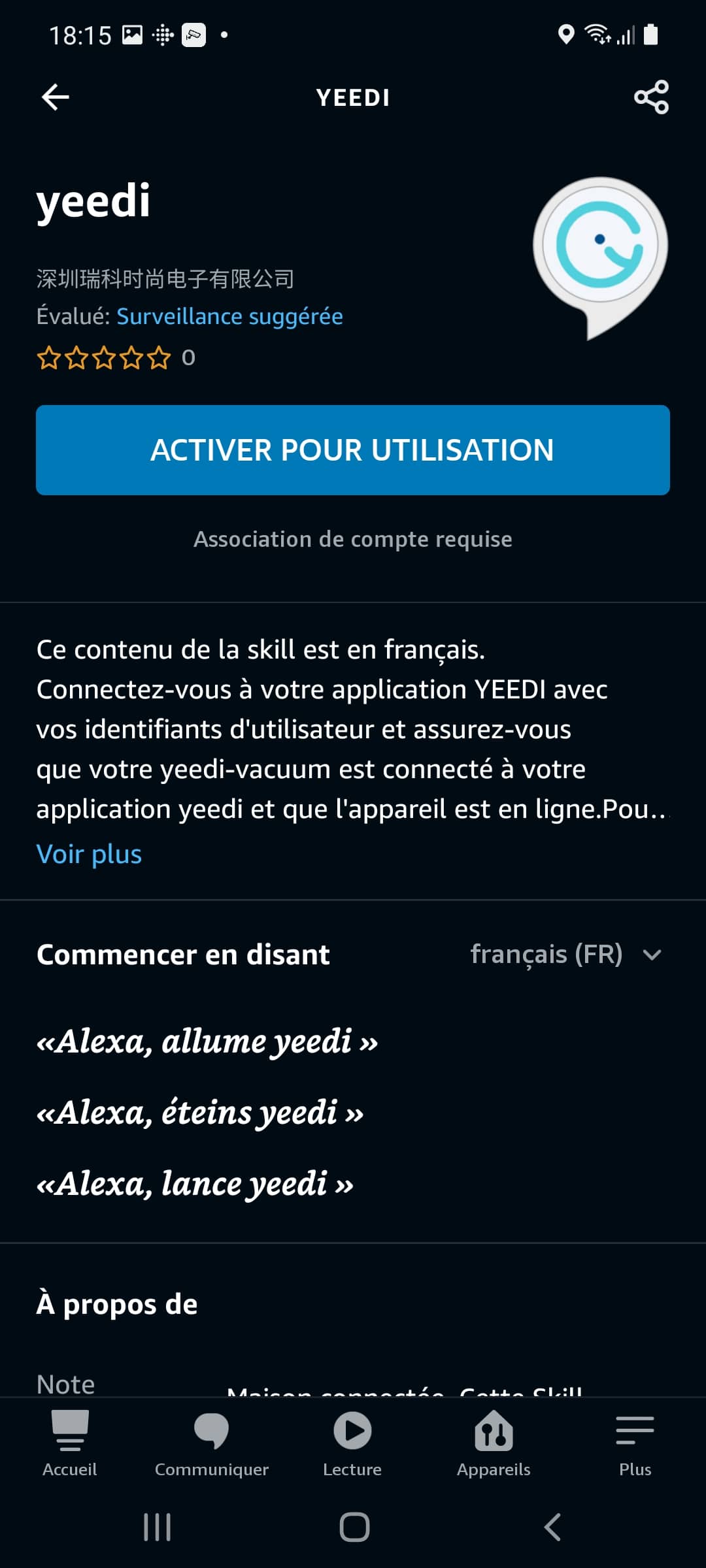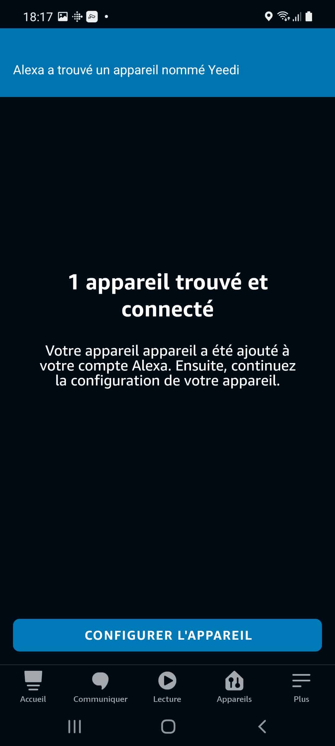 Il faut évidemment activer la skill Yeedi, et lier vos comptes puis laisser Alexa découvrir les nouveaux appareils. Lorsque cela est fait, un message vous rappelle que seul le Yeedi 2 Hybrid est pris en charge et que votre assistante va effectuer une recherche de nouvel appareil… Ça tombe bien, c’est celui que nous testons et… Bingo ! Le voila.