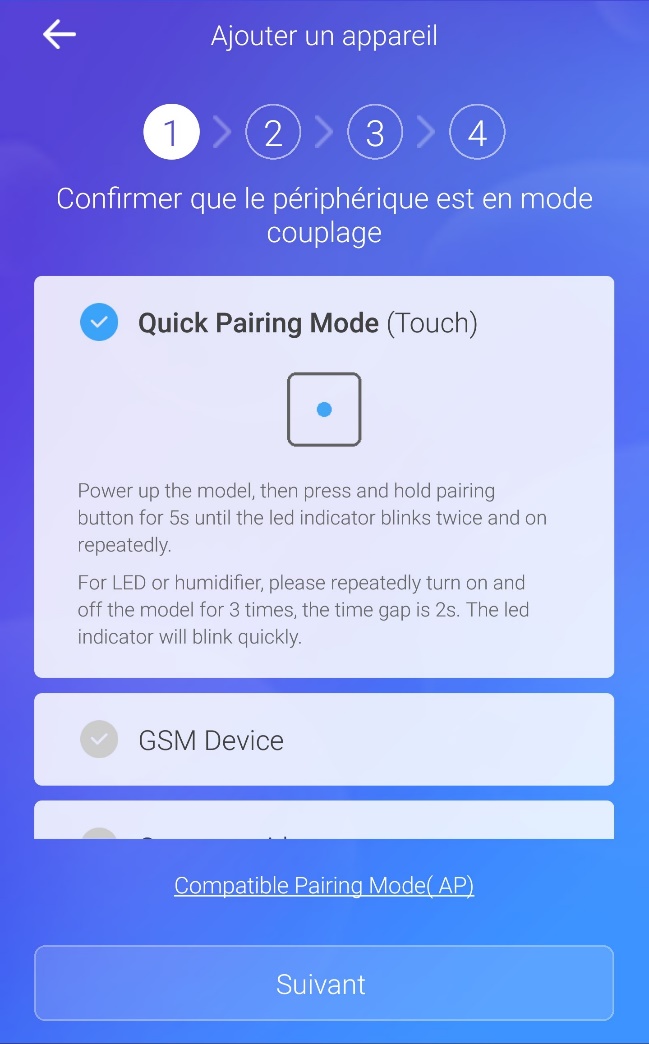 A partir de là, il y a deux possibilités pour appairer le Sonoff. Le mode rapide ou normal, qui ne fonctionne presque jamais, et le mode « forcé ». Nous allons directement utiliser le mode forcé. Pour cela, mettez le Sonoff sous tension en appuyant sur le petit bouton noir une seule fois. Votre plafonnier doit s’allumer. Maintenez ensuite ce bouton enfoncé pendant 5 secondes jusqu’à ce que la LED verte clignote 2 fois rapidement et un fois longuement, en boucle. Maintenez de nouveau le bouton enfoncé 5 secondes jusqu’à ce la LED verte clignote en continu. Sélectionnez ensuite « suivant » et entrez vos identifiants Wi-Fi (vous devrez aussi activer votre GPS).