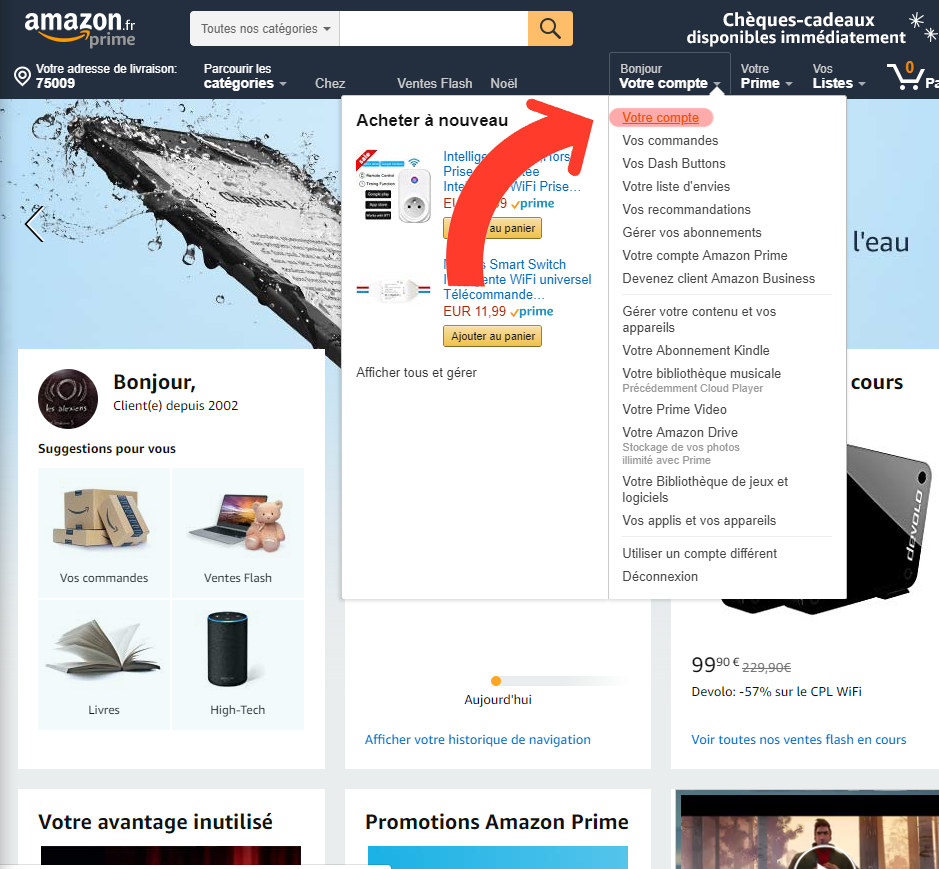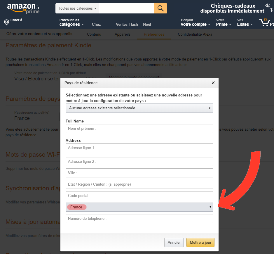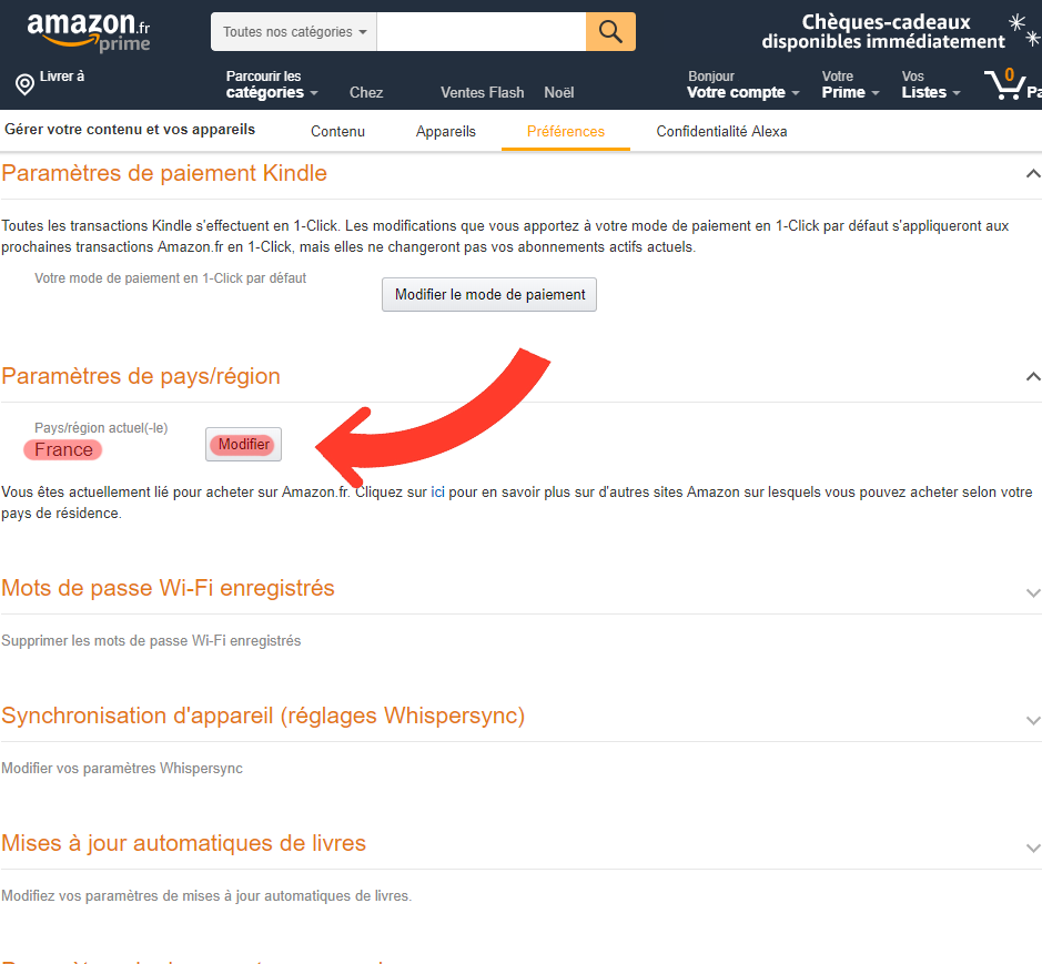Votre compte > Contenu numérique et appareils > Contenu et appareils > Préférences > Paramètres de pays et de région.
