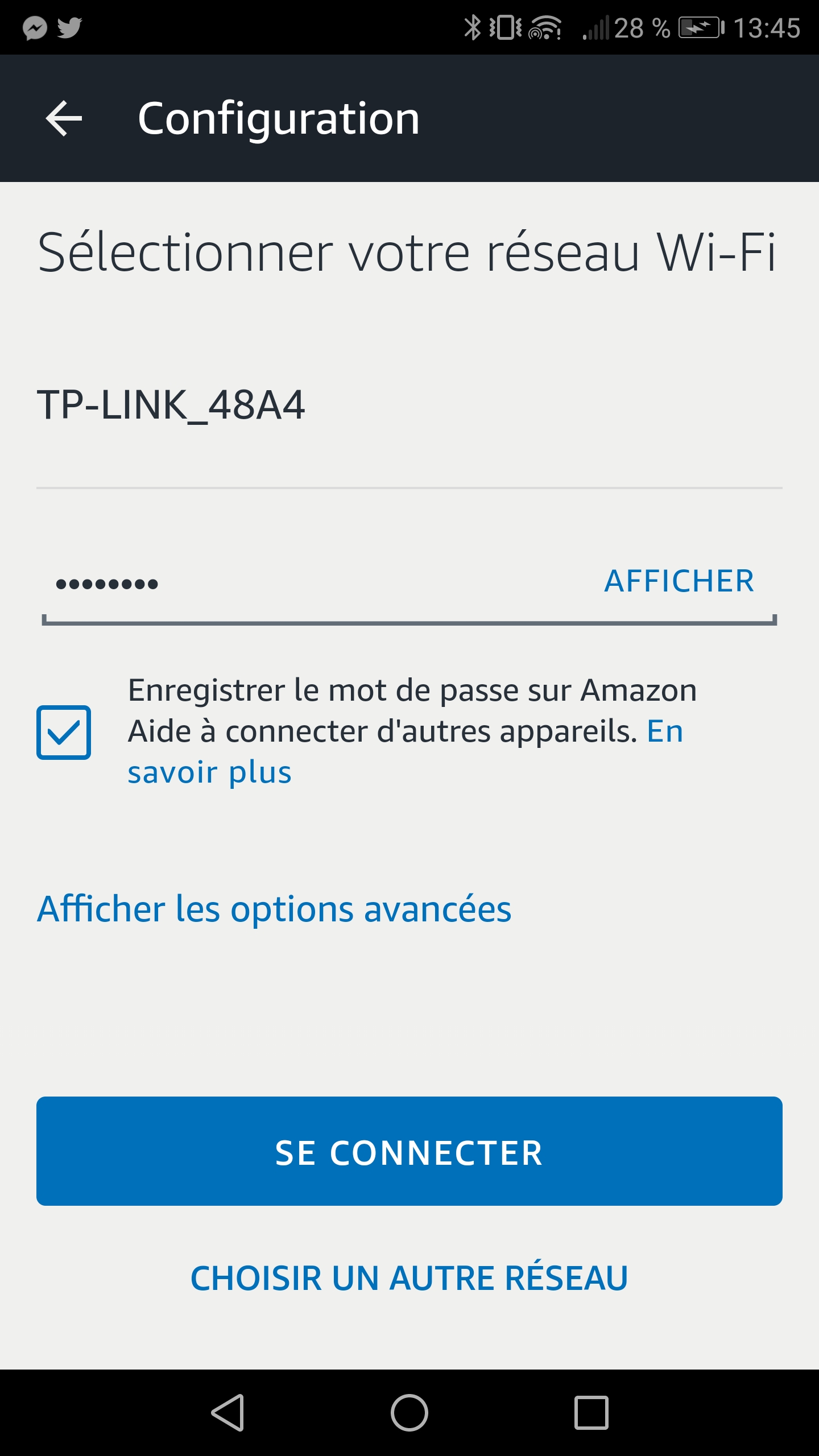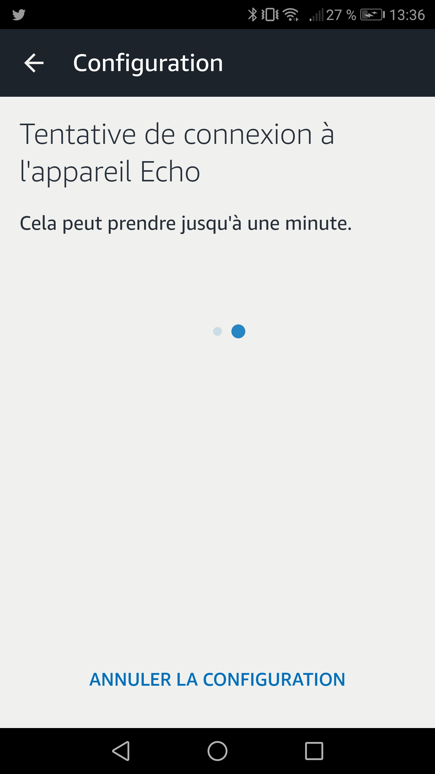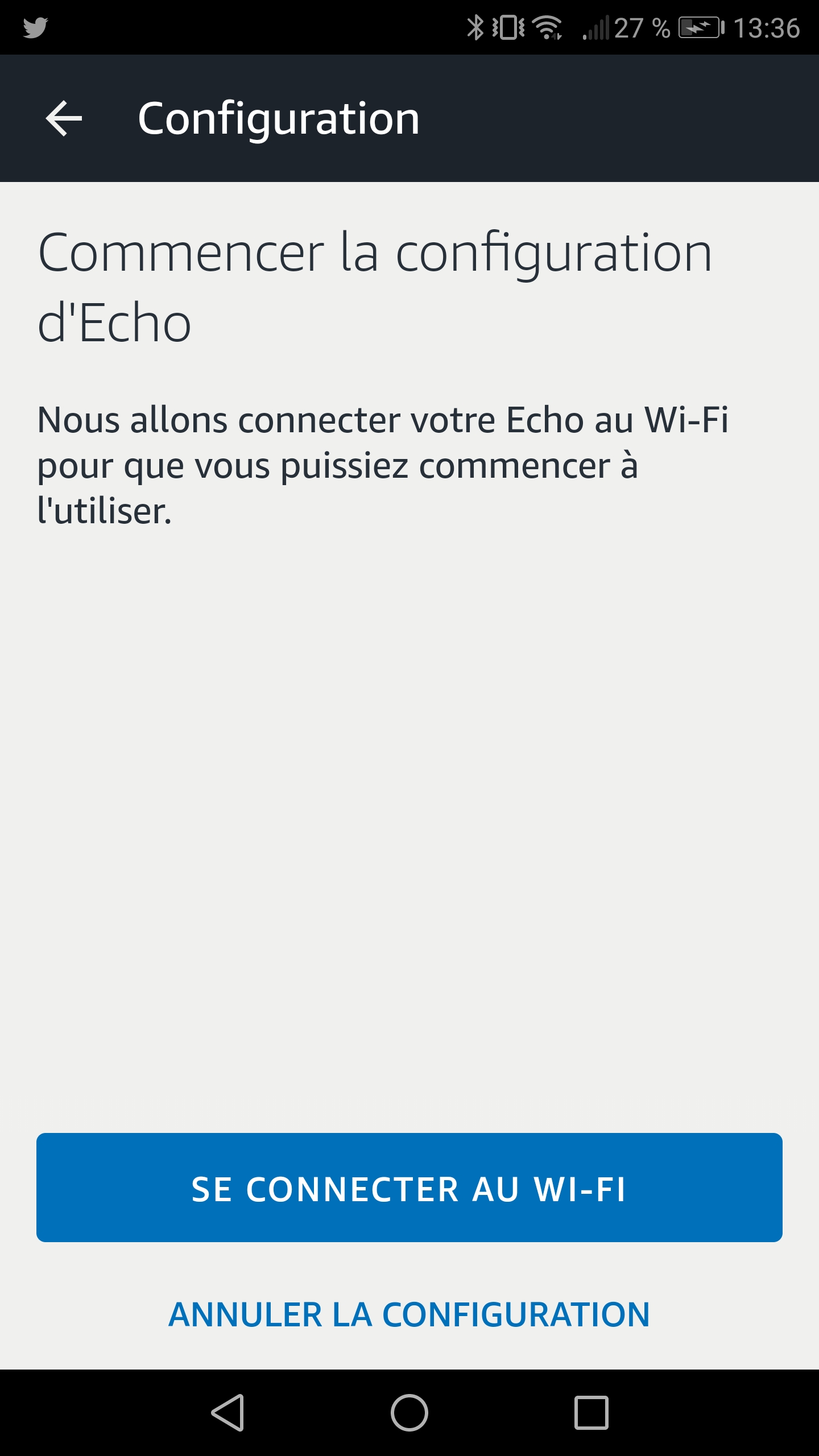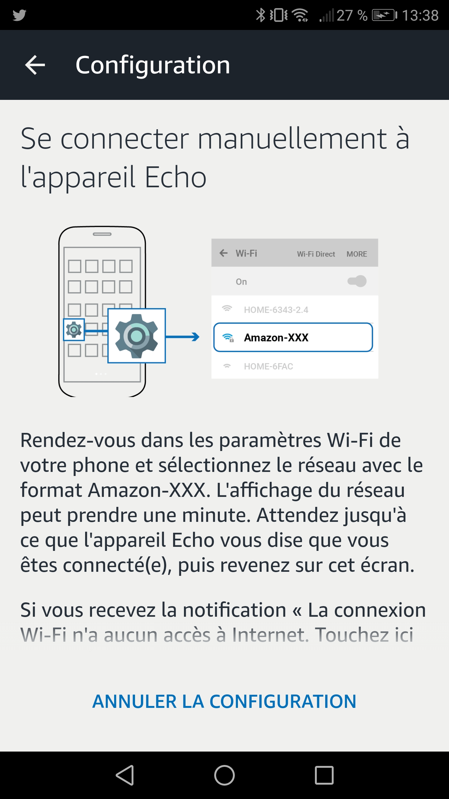 Quand l’appareil a pu être préparé vous aller avoir une notification vous disant que le réseau n’a pas d’accès internet, ce n’est pas grave, faite annuler pour rester sur ce réseau malgré tout. C’est le piège de la configuration manuelle. Ne retournez pas tout de suite sur votre réseau Wi-Fi. La configuration va continuer et là, il vous sera demandé de sélectionner le réseau auquel votre Echo sera associé en permanence (entrer votre clef Wi-Fi et « Se Connecter »).