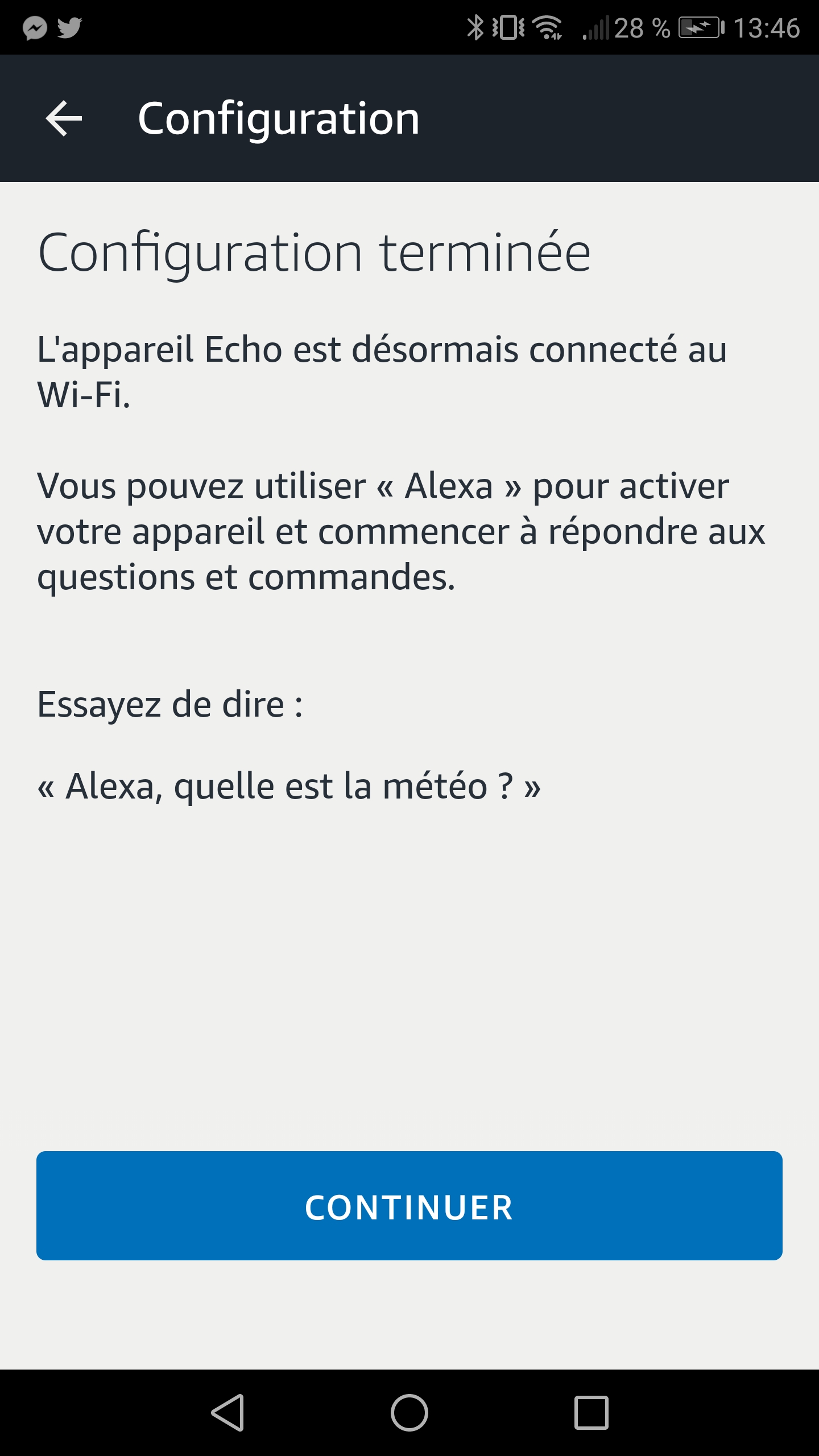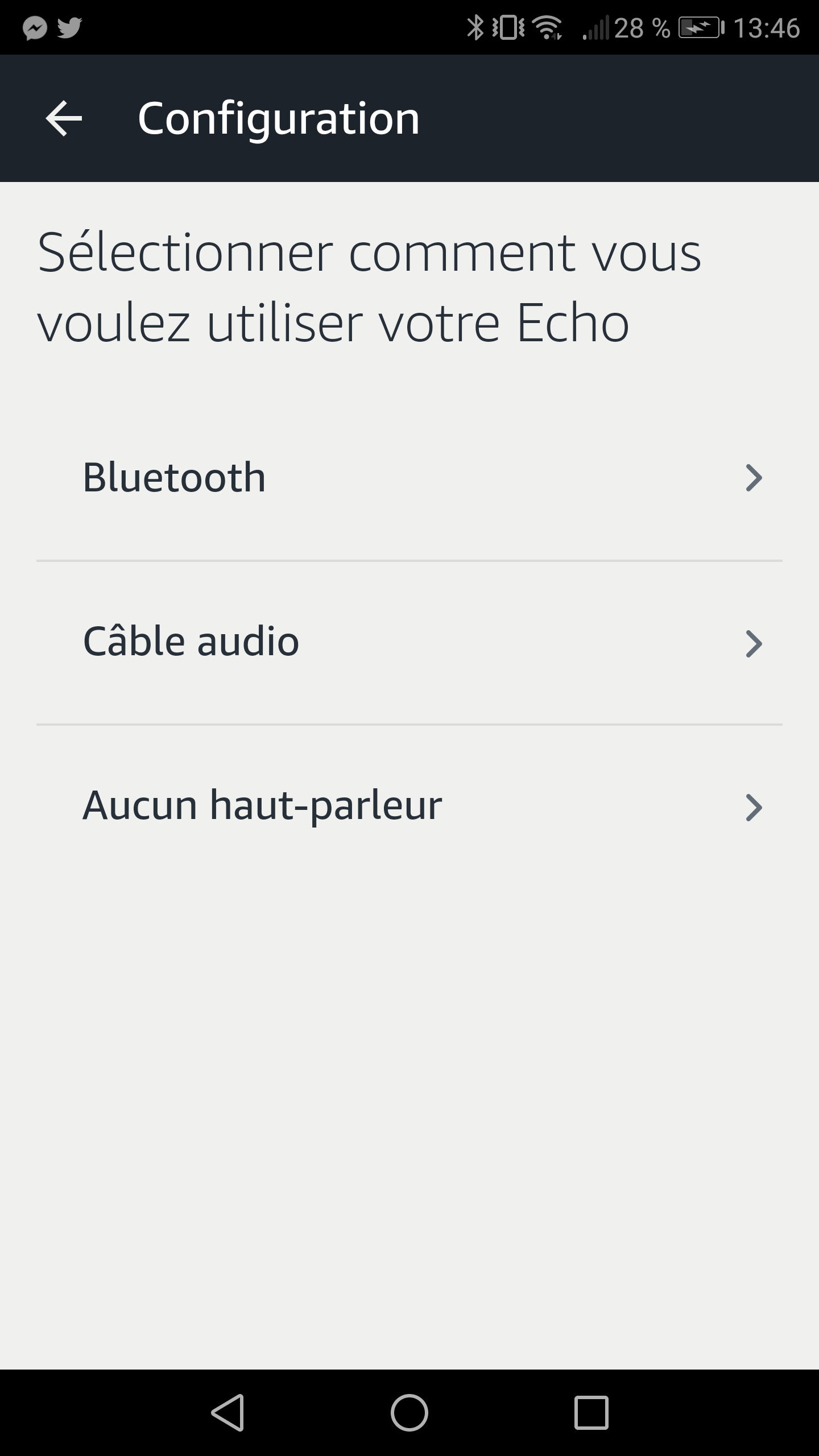 La configuration terminée, il y encore un petit quelque chose à faire. Après avoir cliqué sur « Continuer », il vous faudra choisir comment le son de votre Echo sera diffusé : Bluetooth, Câble audio ou directement par l’Echo (aucun haut-parleur). Je vous invite à sélectionne aucun haut-parleur car le reste est facilement configurable quand vous en aurez besoin.
