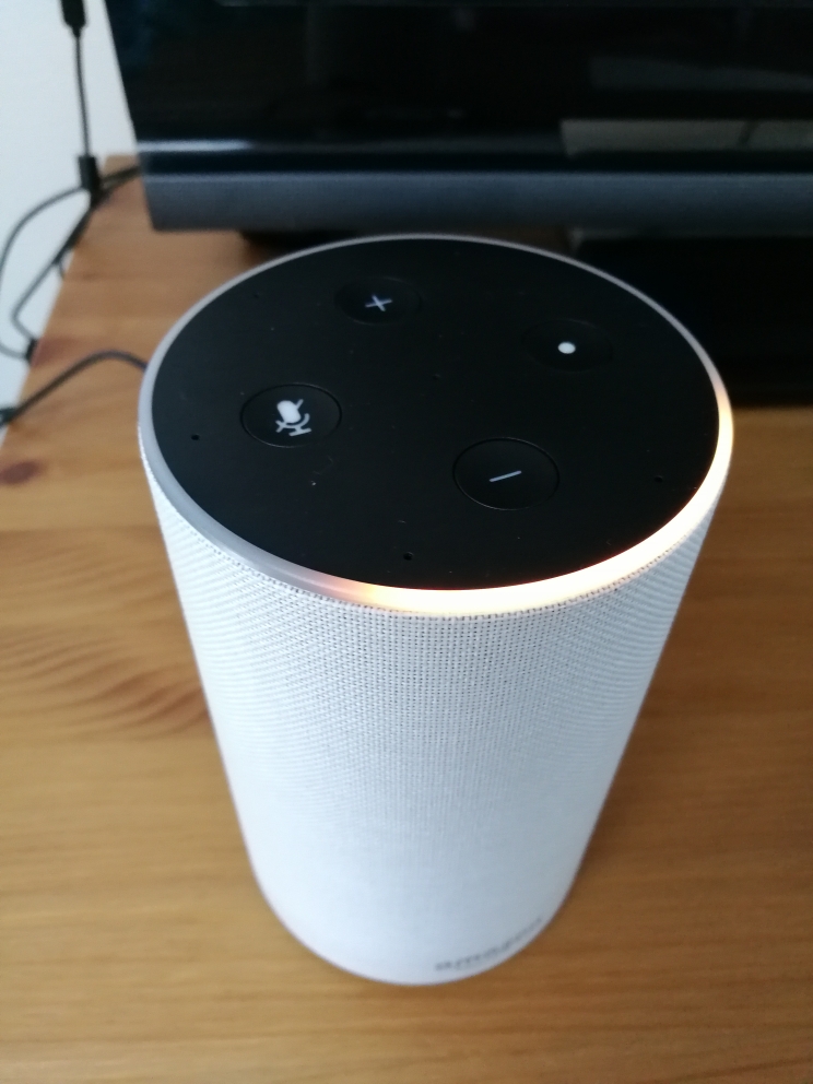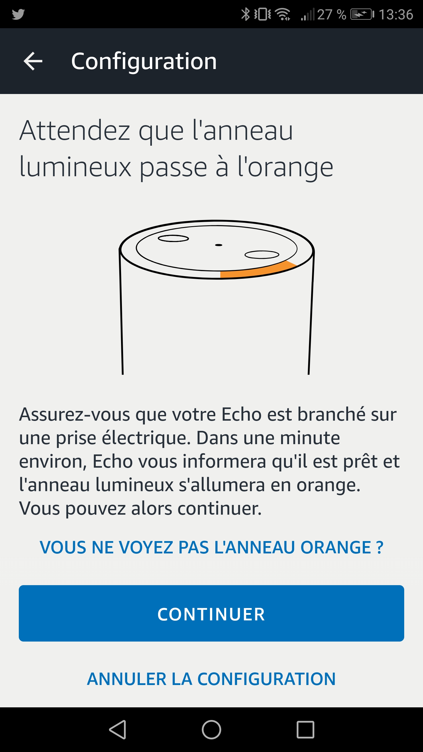 Une fois mis sous tension, un anneau bleu va apparaitre sur le haut de votre Echo et tourner le temps qu’il s’active. Quand cela sera fait, une jolie voix va vous annoncer qu’il faut télécharger l’appli Alexa et suivre ce que mentionne ladite application. Juste après, c’est un anneau orange qui va se mouvoir sur le haut de votre Echo
