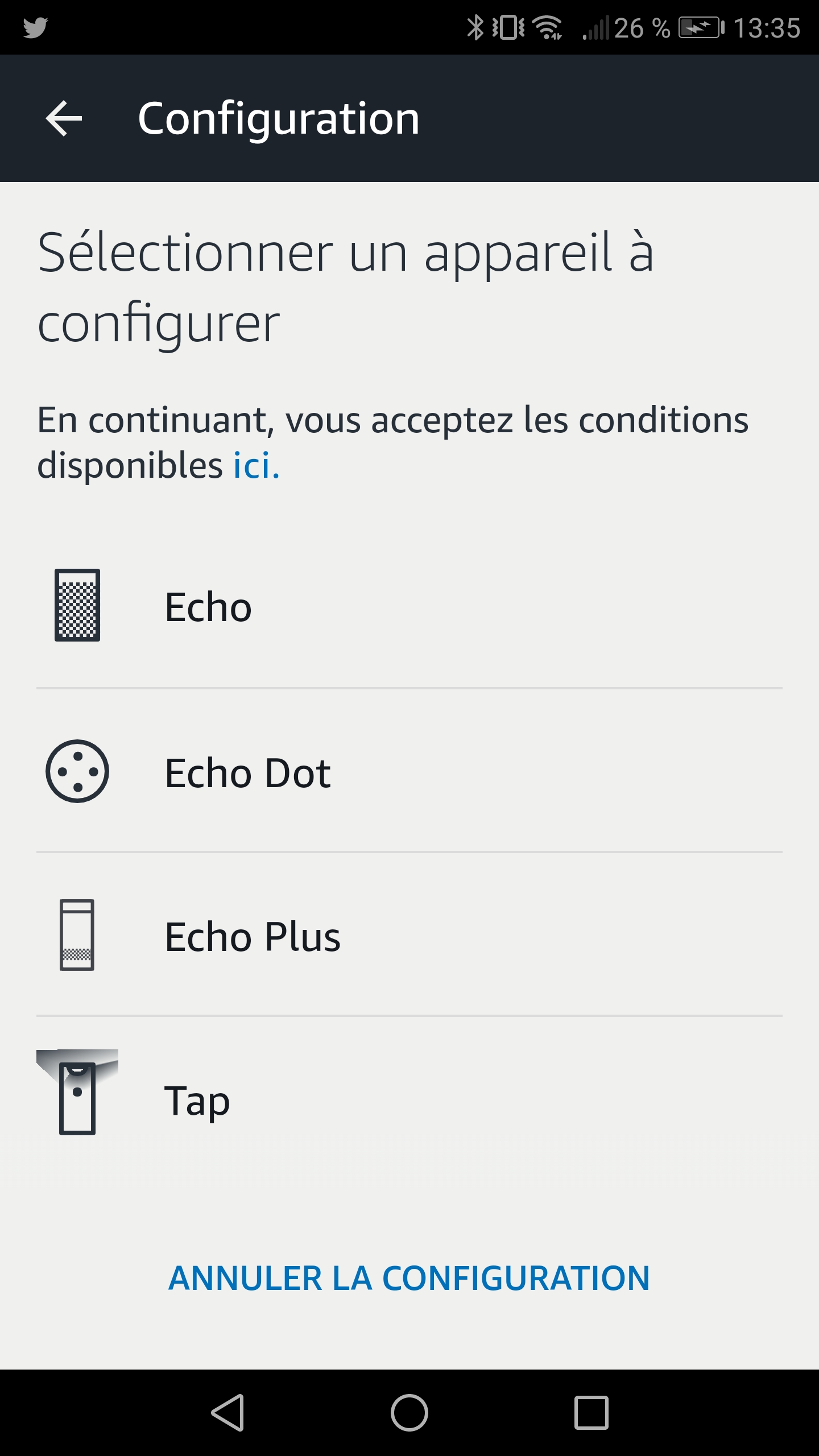 Quand le halo orange mouvant est bien présent, lancer votre application Alexa, sélectionnez « Appareils Alexa » et « ajouter un appareil Alexa ». Sélectionner ensuite le type d’appareil que vous avez acheté.