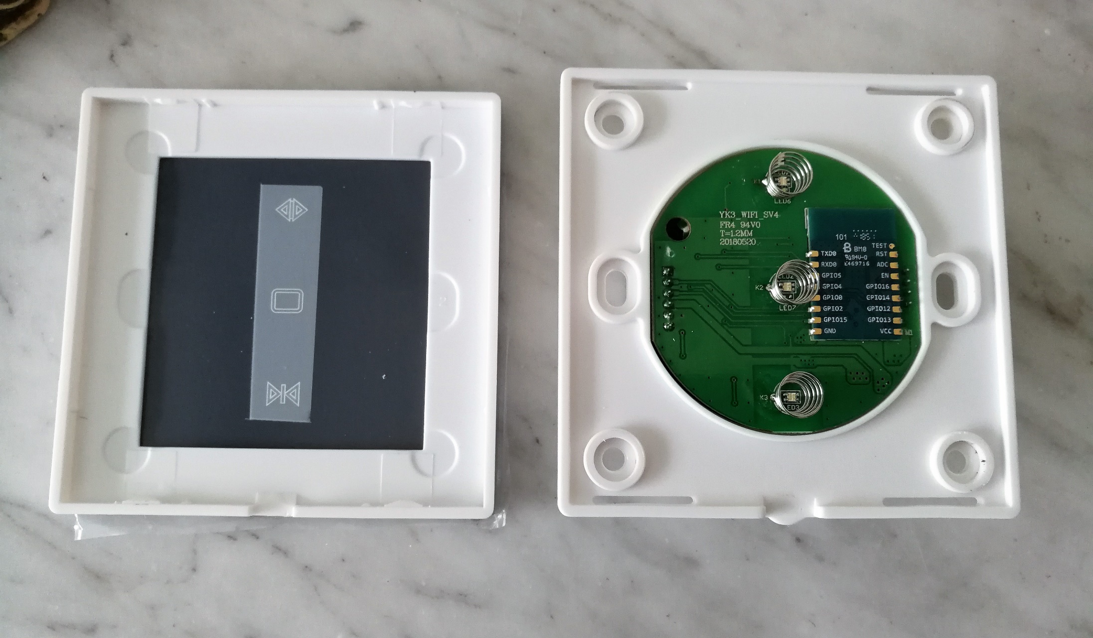 Un conseil pour voir si tout fonctionne bien avant de tout bien encastrer dans la boite et de remettre la façade : appuyez sur les ressorts pour voir si vos volets montent, descendent et s’arrêtent. En cas de problème, refaite le point sur vos branchements. Si c’est bon, rentrez tout à l’intérieur, vissez et cacher le tout avec la façade ! Attention, comme nous l’avons vu, trois petits ressorts vont faire contact pour enclencher le mécanisme. En appuyant sur la façade, on va venir appuyer sur les ressorts et donc activer la remontée ou la descente du volet. Cela peut aussi expliquer les problèmes que rencontrent des utilisateurs avec ce type de système. Si la façade n’est pas bien mise (trop enfoncée par exemple), il peut y avoir un contact permanent ou aléatoire avec l’un des ressorts et donc faire ouvrir ou fermer le volet de façon impromptue.