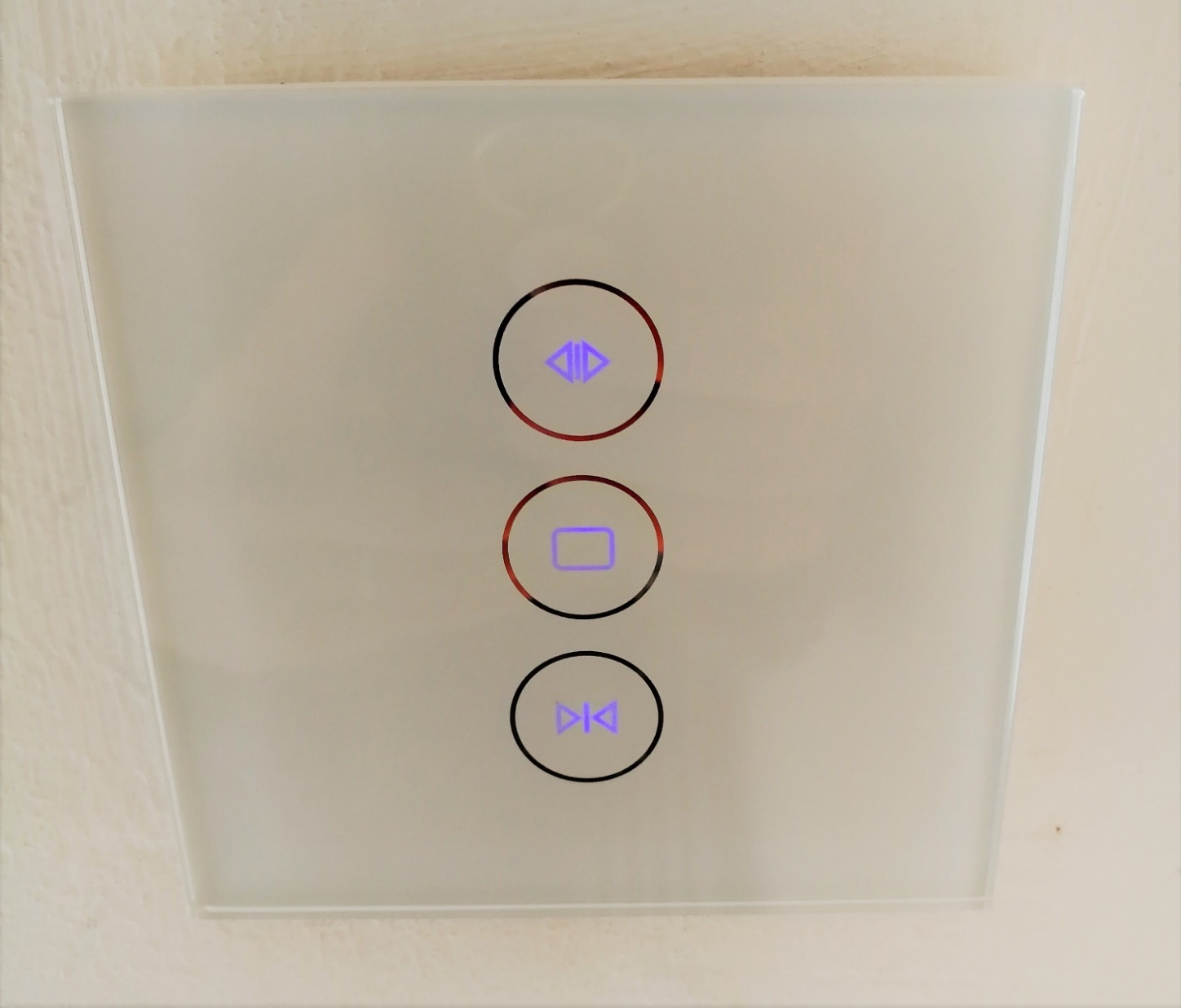 Pour fixer l’interrupteur, il est nécessaire d’enlever la façade en passant un tournevis plat dans la partie basse. Vous aurez ainsi accès aux deux trous pour venir insérer les vis de fixation dans la boite d’encastrement. Une fois tout raccordé, votre interrupteur se parera de 3 lumières bleues et, ô miracle, celle du haut clignotera aussi en rouge assez rapidement. C’est le mode appariement. Si vous avez un problème et que l’interrupteur quitte ce mode par la suite, plutôt que de le débrancher et tout donc tout démonter, appuyez 20 s sur la touche du haut.