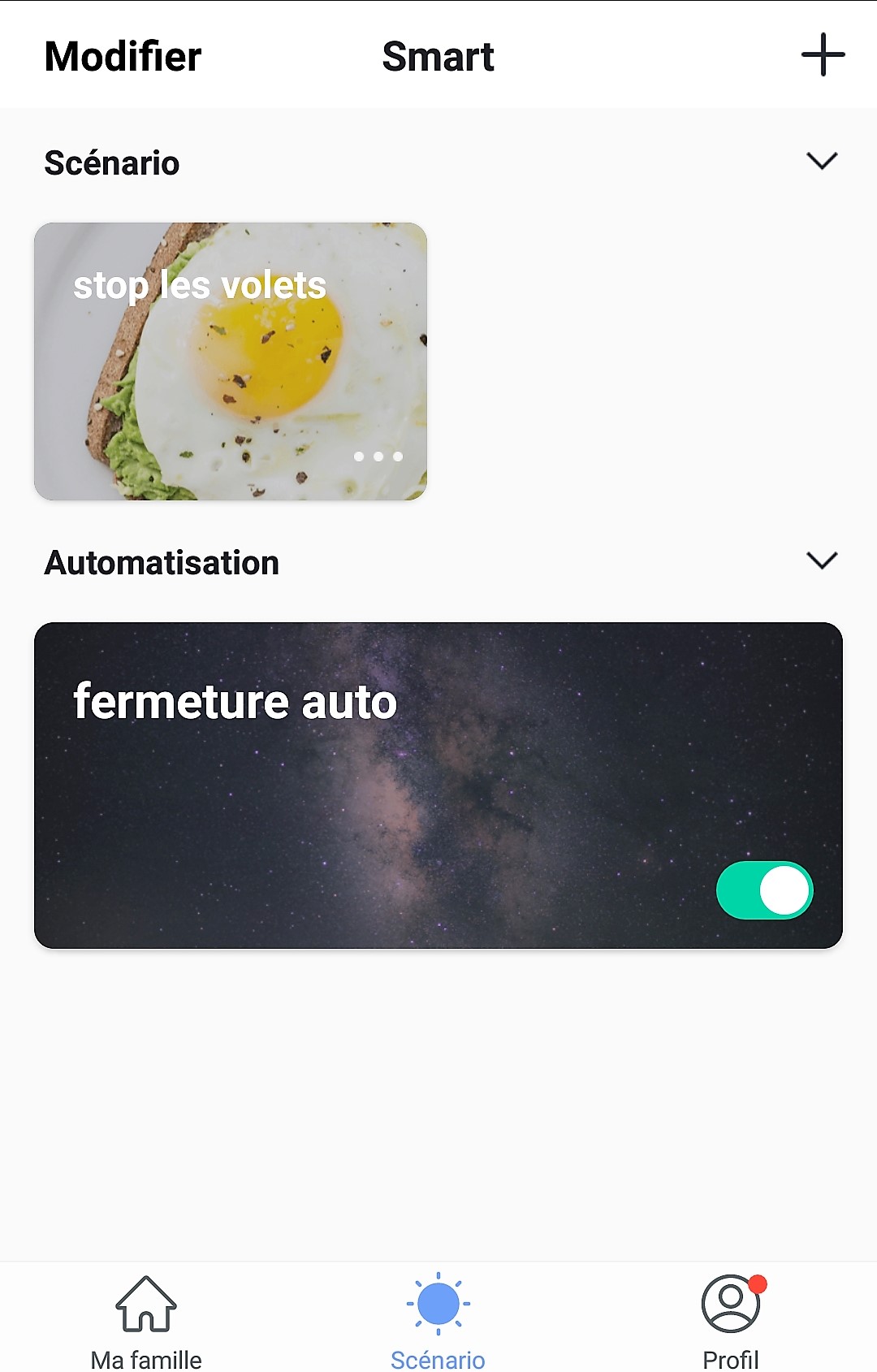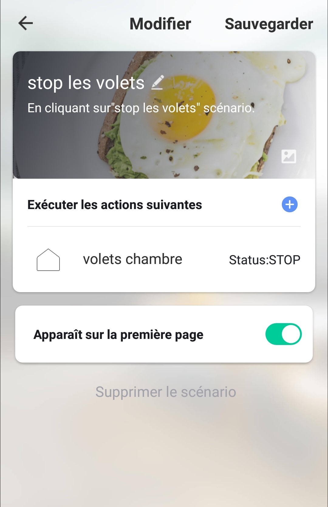 Votre scénario est maintenant utilisable. Testez-le en appuyant sur l’icône de votre scénario pendant que votre volet monte ou descend. S’il n’y a pas de problème, passons à son intégration dans une routine qui devra ressembler à cela :