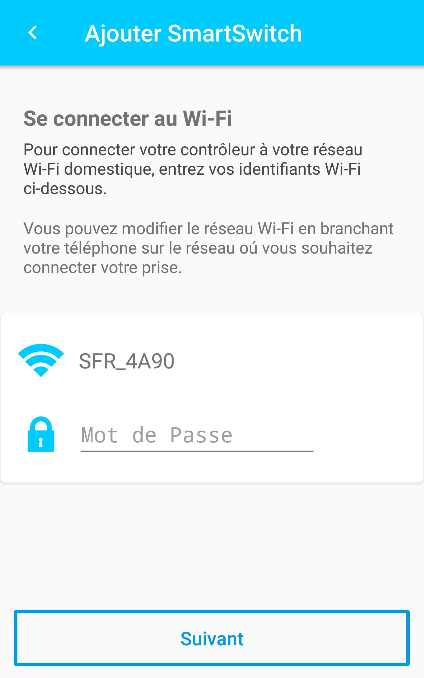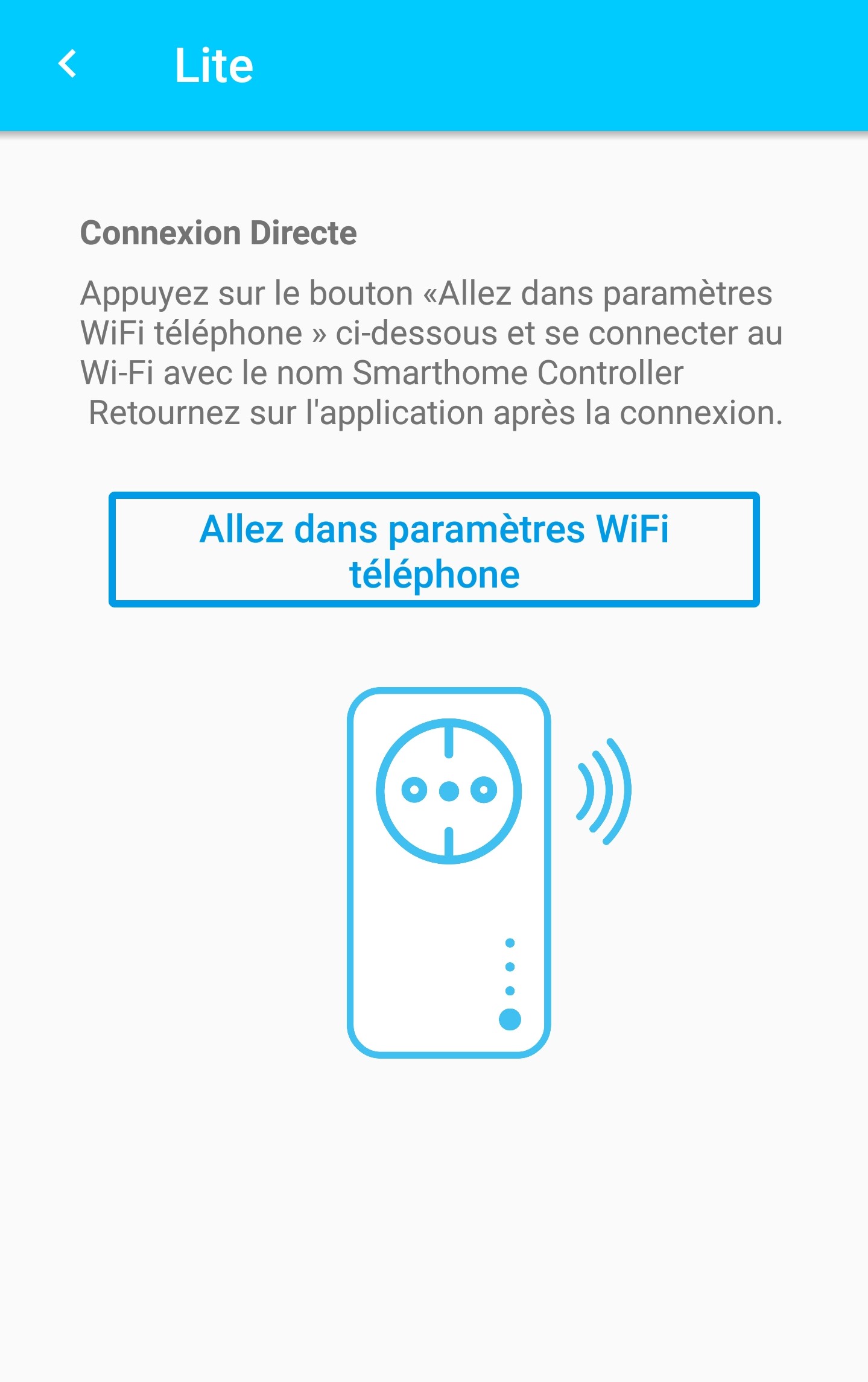 L’application a prévu ce cas et vous propose une connexion directe à la prise. Pour cela, maintenez de nouveau le bouton power enfoncé jusqu’à ce que le voyant clignote rapidement. Puis l’application vous demande d’aller dans vos paramètres Wi-Fi et d’y sélectionner le réseau ayant pour nom Smarthome Controller…