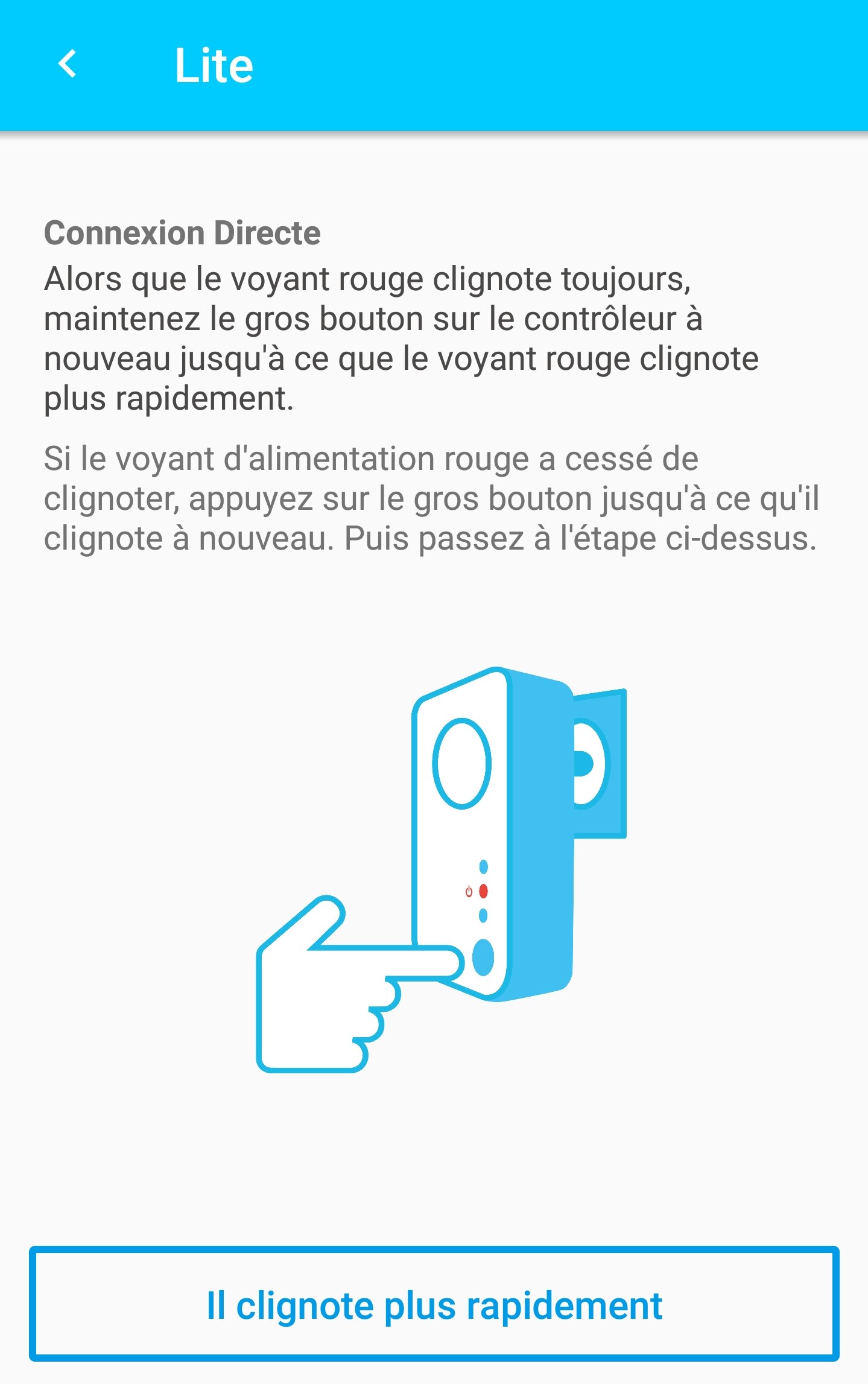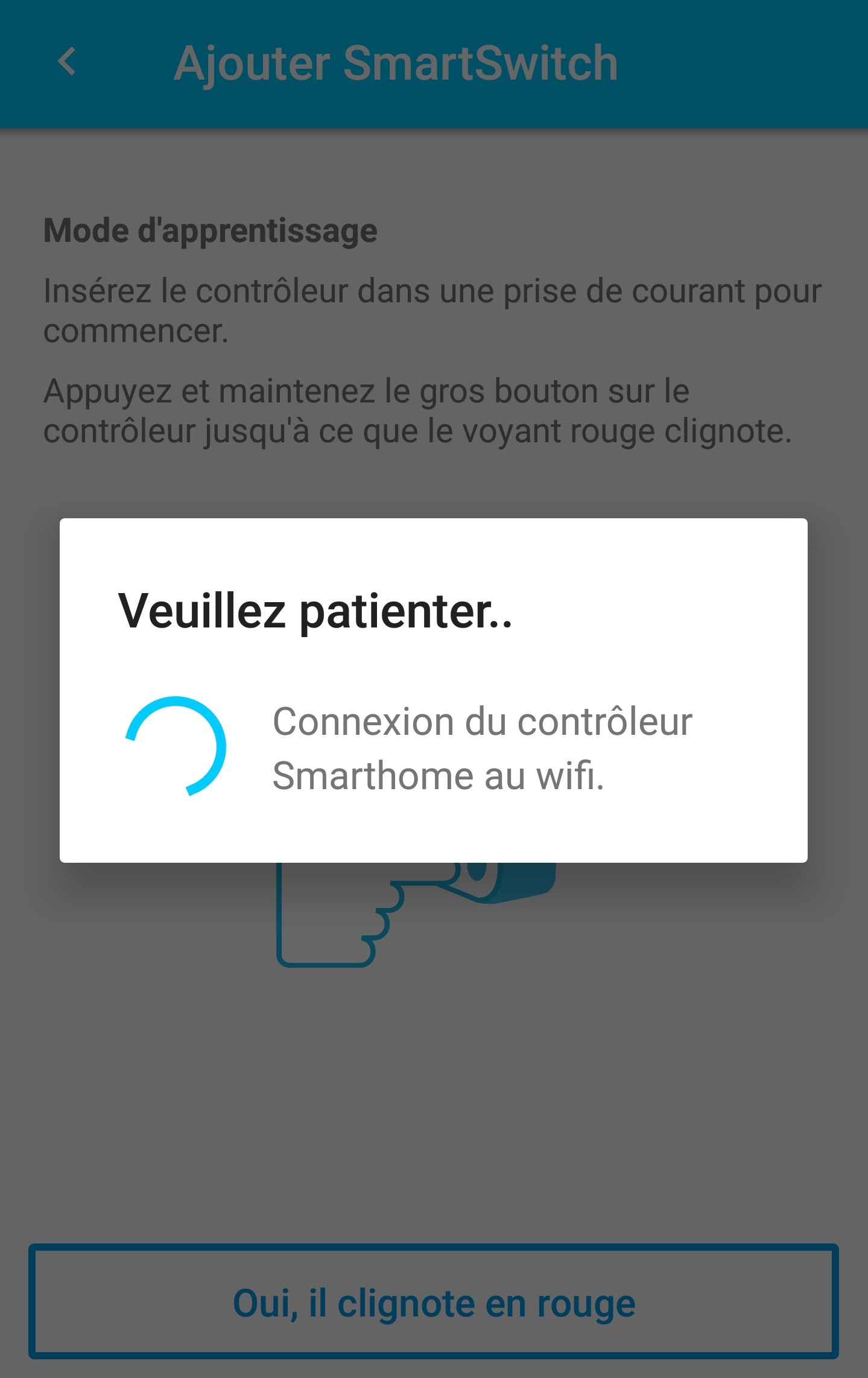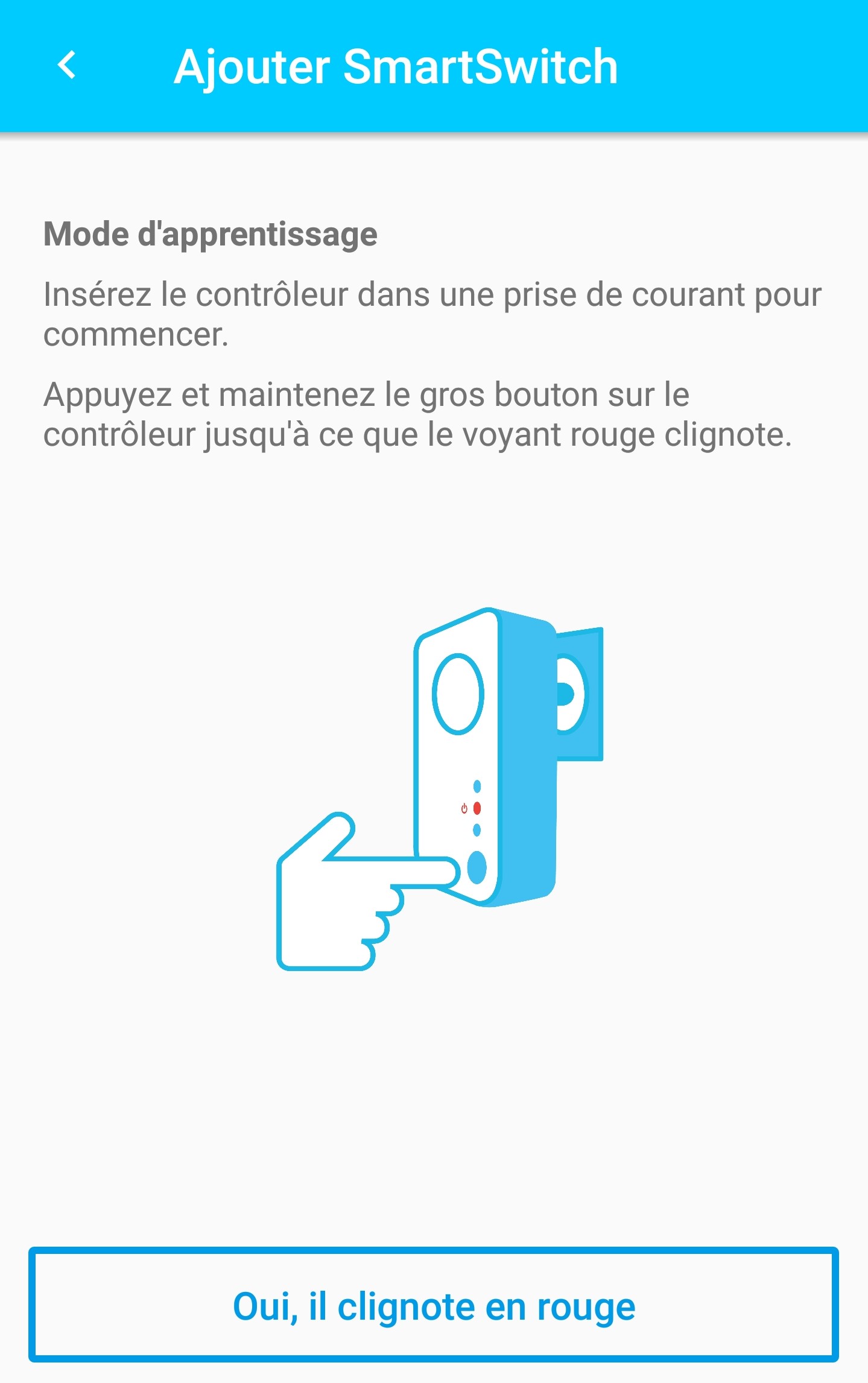 C’est parfois à cette étape que certains auront des problèmes avec l’impossibilité de valider le code Wi-Fi. Si vous passez cette étape, branchez votre prise et maintenez enfoncé le bouton power jusqu’à ce que la LED rouge clignote. Sélectionnez ensuite « Oui, il clignote en rouge » et attendez… Et c’est là qu’un deuxième problème arrive souvent, la prise n’est pas reconnue…